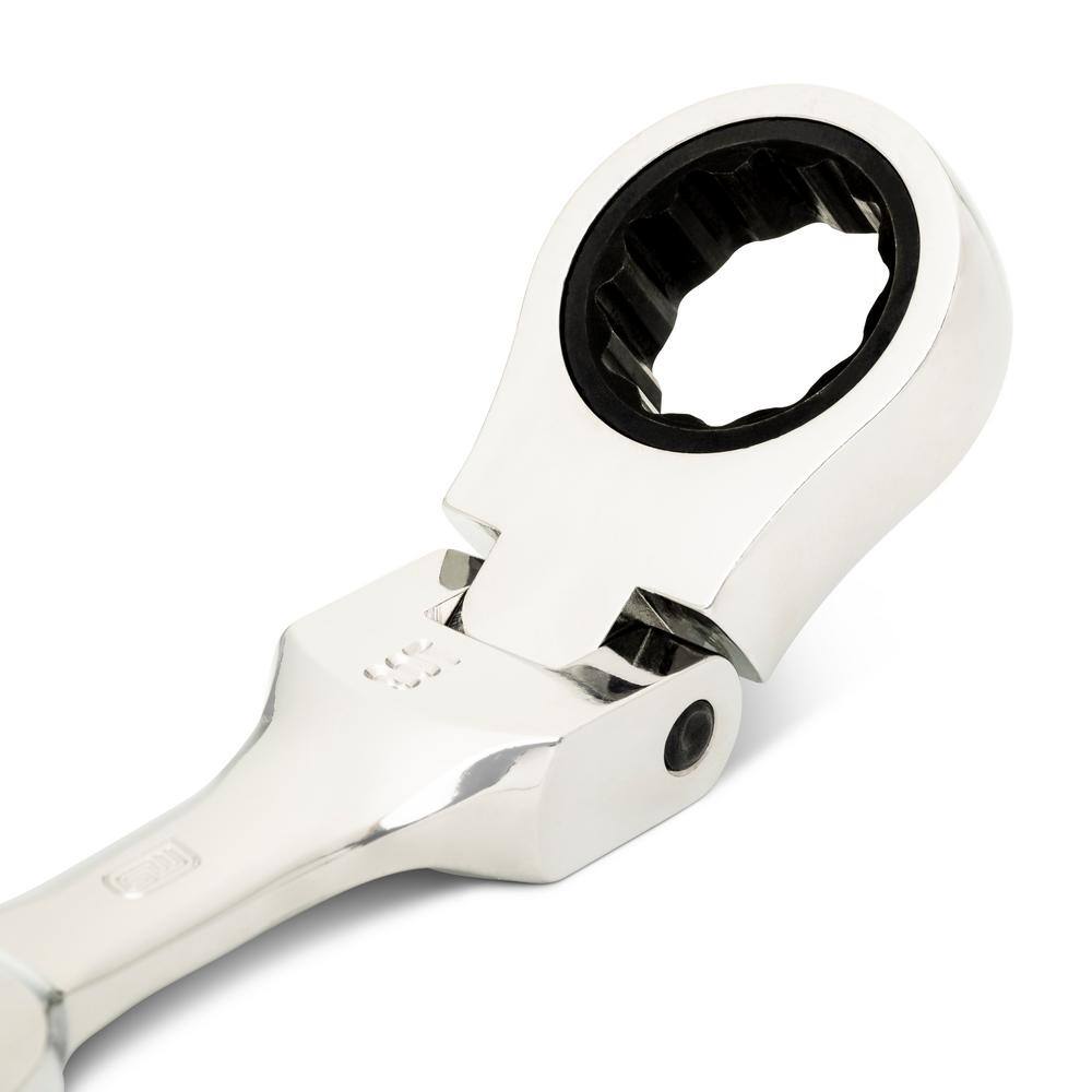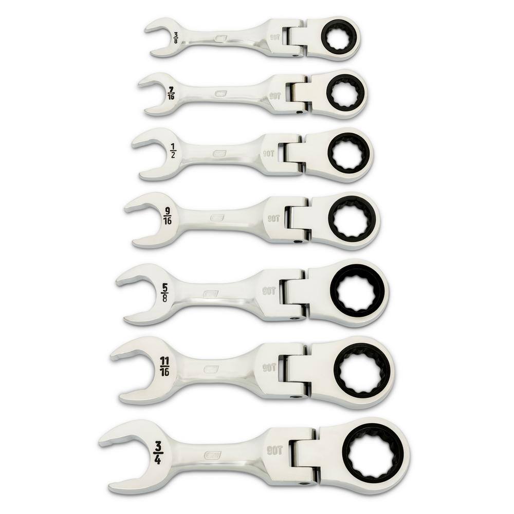 - 7-piece set includes stubby ratcheting flex combination wrenches in SAE sizes 3/8″, 7/16″, 1/2″, 9/16″, 5/8″, 11/16″, and 3/4″