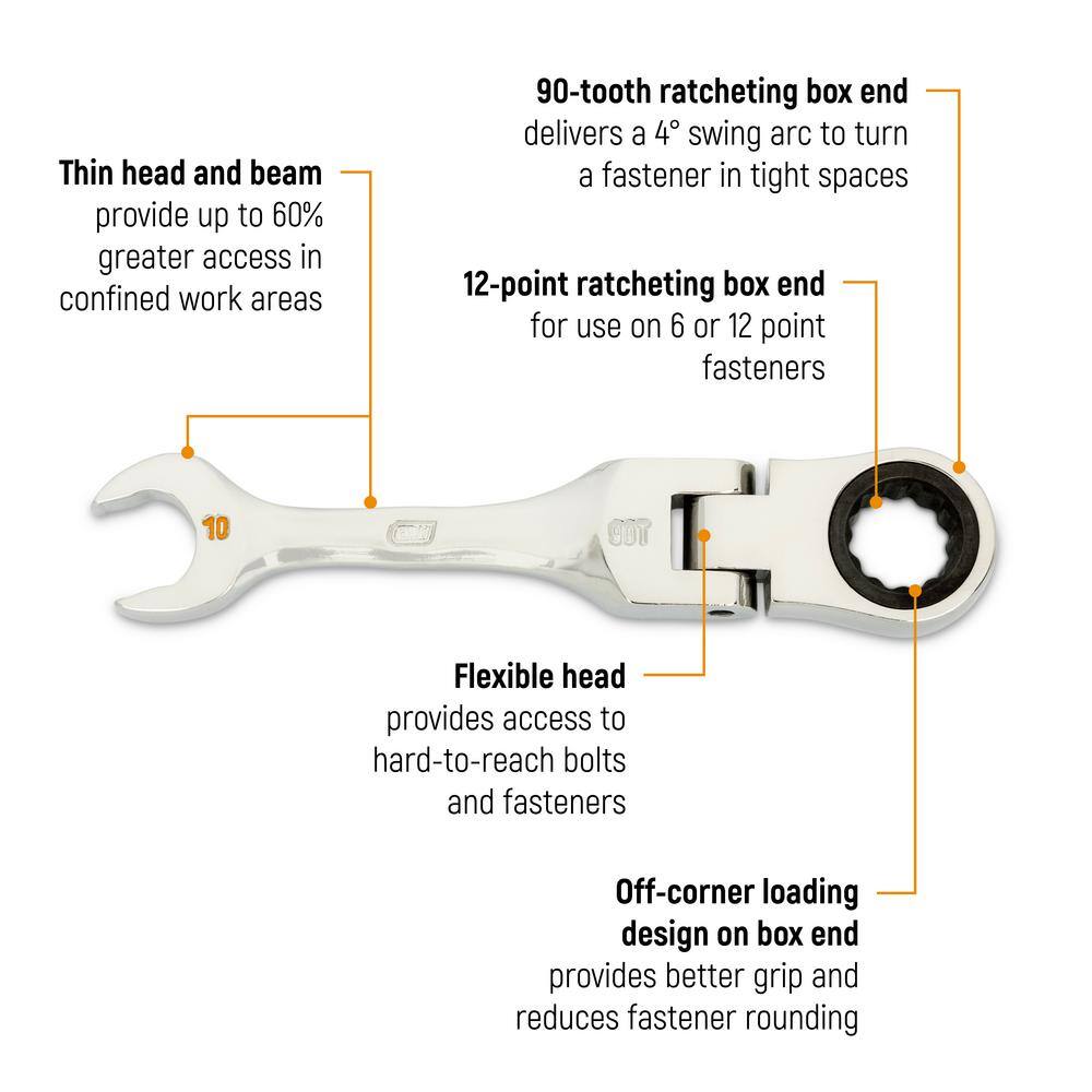 GEARWRENCH 90-tooth stubby combination ratcheting wrenches feature a 4° ratcheting arc vs. 30° on a standard combination wrench increasing productivity. These wrenches offer up to 60% greater access than the original GEARWRENCH ratcheting wrenches thanks to an optimized beam and smaller open and box end. Also featuring off-corner loading for better grip and reduced fastener rounding, our wrenches have a sleek head design which allows access to tight spots where a ratchet would not fit.