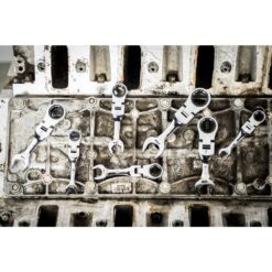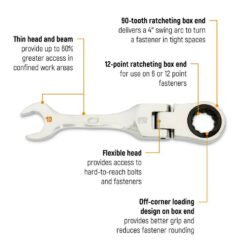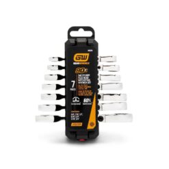 - 7-piece set includes stubby ratcheting flex combination wrenches in SAE sizes 3/8″, 7/16″, 1/2″, 9/16″, 5/8″, 11/16″, and 3/4″
