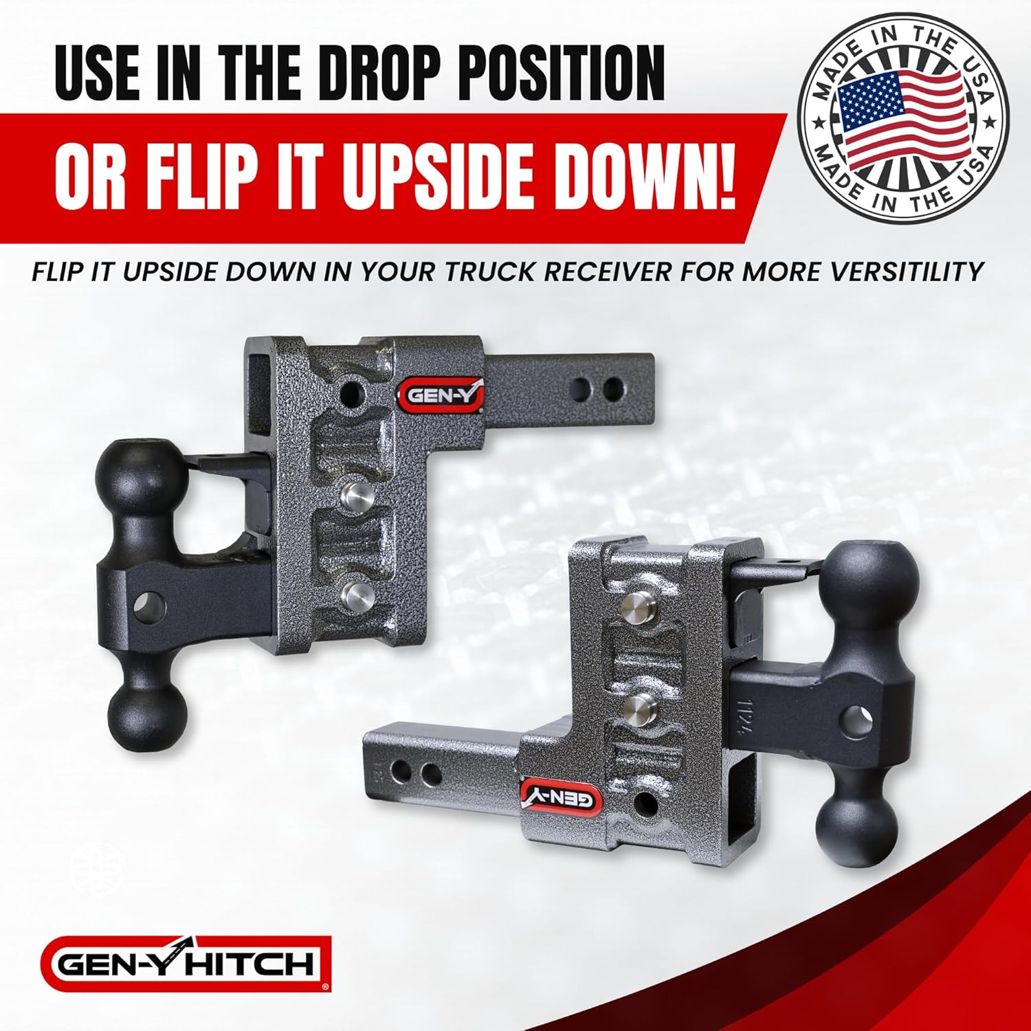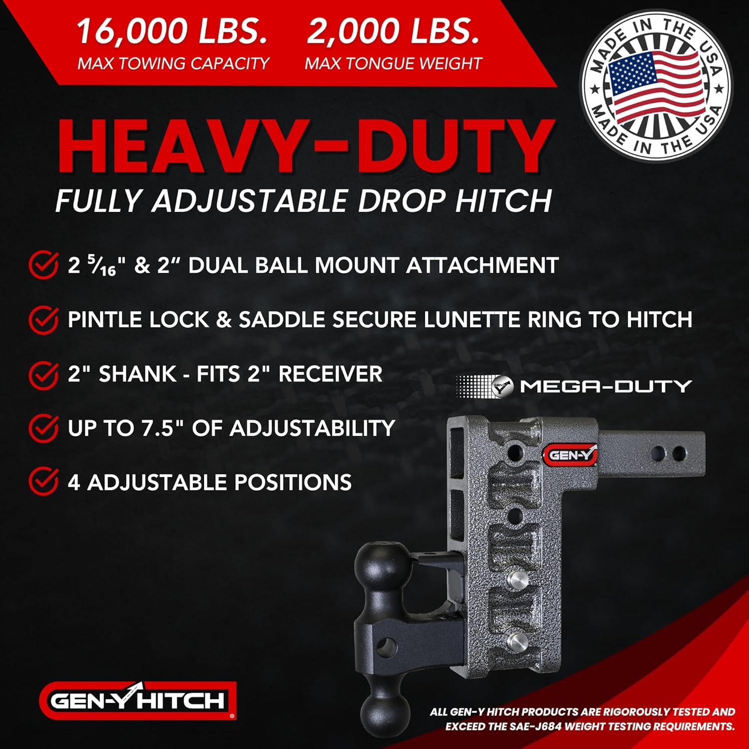 GEN-Y Hitch Adjustable Trailer Hitch for 2-Inch Receiver – 7.5″ Drop, 16000 lbs Towing, 2000 lbs Tongue Weight, Includes Dual Ball-Mount Attachment (2 5/16″ & 2″), Pintle Lock, 2 Stainless Steel Pins