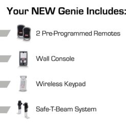 - Includes two preprogrammed, 3-button Genie remotes, multi-function wall console and wireless keypad