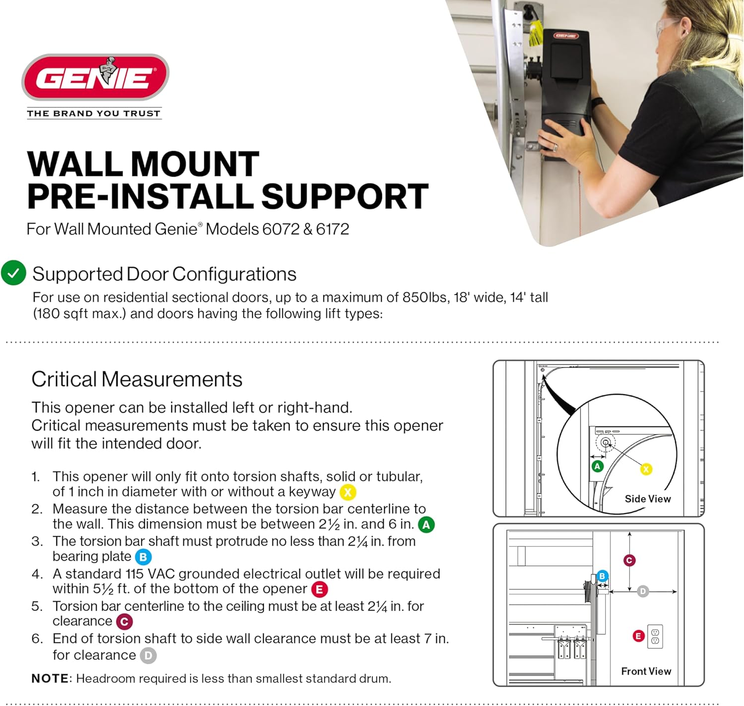 - STRONG, COMPACT DESIGN: Compact design measuring 6.8 in. wide x 14.5 in. tall x 9 in. deep making the Genie wall mount garage door opener the smallest available, Proper installation requires a standard outlet within 6 ft. of the wall mount garage door opener