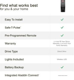 | Included Components | INCLUDES: (1) 3 Button Pre-programmed Remote, Battery Backup, Wireless Wall Console, , Automatic Door Lock |