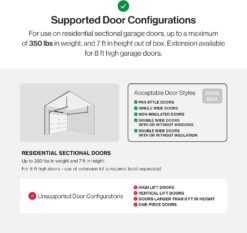 | Usage | ‎Inside, Works on residential sectional garage doors only up to 7 ft in height and 350lbs in weight |
