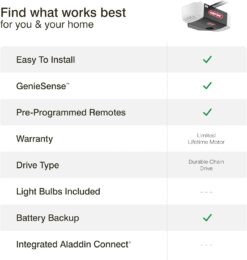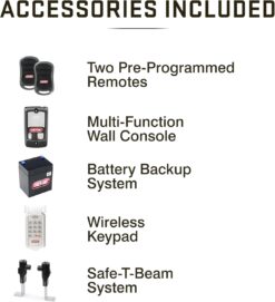 | Included Components | Includes Genie Chain drive garage door opener, 12 V Battery Backup, 2 pre-programmed 3 button garage door opener remotes, wireless keypad, safety beams installation instructions |