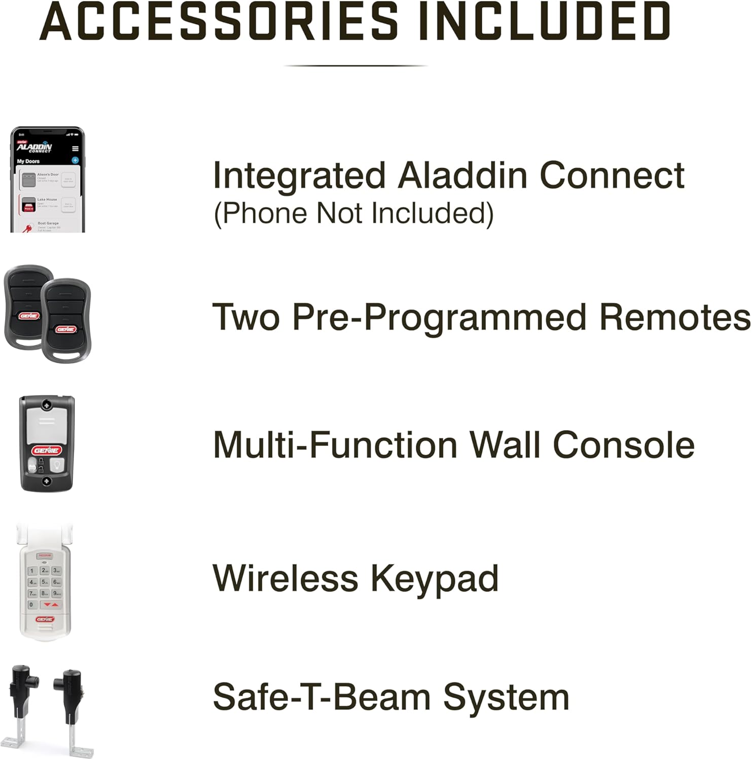 - GARAGE DOOR ACCESSORIES: This smart garage door opener comes with built-in Aladdin Connect, two pre-programmed 3-button remotes, a wireless keypad, and a multi-function wall console.