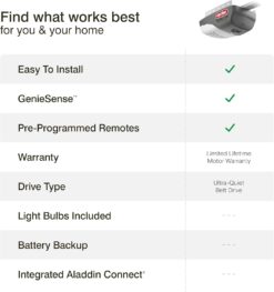 | Included Components | ‎safety sensors, hardware, batteries, detailed installation instructions and owners manual, wireless keyless keypad,, Includes 140 volt belt drive garage door opener for 7 foot high doors,, 2 3-button preprogrammed garage door opener remotes, wall control with light button and vacation lock, |