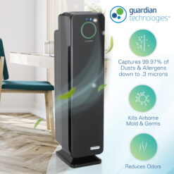 The power Air Purifier is perfect for allergy sufferers. True HEPA media captures 99.97% of allergens including pet dander, dust mites and pollen. According to the American Academy of Pediatric Allergy and Immunology, doctors recommend HEPA air filtration to reduce exposure to indoor asthma triggers. More than just a filter, the UV-C light helps to kill germs, while the charcoal filter captures odors. CADR Rated 125+ and standing 28 in. tall, it is lightweight and ideal to use in medium to large sized rooms. The easy-to-use smart app that allows you to monitor the air quality in your home from EVERYWHERE. This Smart Air Purifier is Voice Control Capable with an Alexa Skill. It includes SmartAQM, an Air Quality Monitor that detects the amount of particles in the air and automatically adjusts the speed to optimize room air quality when in auto mode. The Guardian Technologies App will tell you when you need to replace your filter or bulb and will also keep you updated on the allergy conditions in your area! Choose from 5 speeds, including a low speed that runs ultra-quiet and is energy efficient. The Elite Collection provides both form and function to provide a superior air cleaning system. The simple, stylish design looks great in any home environment.