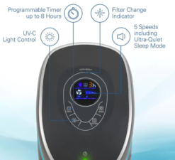 The 5-in-1 True HEPA Air Purifier is perfect for allergy sufferers. True HEPA captures 99.97% of allergens including pet dander, dust mites and pollen. The Pet Pure is an antimicrobial agent added to the filter to inhibit the growth of mold, mildew and odor-causing bacteria on the surface of the filter. According to the American Academy of Pediatric Allergy and Immunology, doctors recommend HEPA air filtration to reduce exposure to indoor asthma triggers. More than just a filter, the UV-C light kills germs, while the charcoal filter captures odors. CADR Rated 125+ and standing 28 in. tall, it is lightweight and ideal to use in both medium to large rooms. The easy to use digital display panel includes UV-C control, a filter change indicator and an up to 8 hour timer. 5 speeds provide high speed allergen control down to ultra-quiet sleep mode.