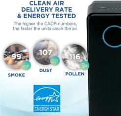 - Electric controls for 3 speed settings, UV-C light control and a filter change indicator—for rooms up to 153 square feet.
