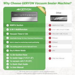 - Two Sealing Modes: Geryon vacuum food sealer is designed with two selectable modes to provide your food with best possible preservation based on your different types of food. You can also reseal bags of rolls, snacks that you only want to seal