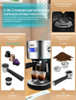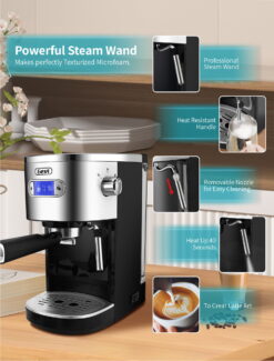 Gevi 20 Bar 2-in-1 Black 40.58 fl oz Espresso Machine with Milk Frother only need 25-45s to finish a cup of espresso. With its stainless steel finishes, this powerful machine looks great in any kitchen and will enhance your entire espresso, cappuccino and latte experience.