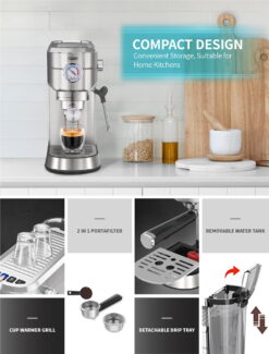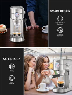 Gevi 20 Bar Professional Espresso Machine with 35 Oz Removable Water Tank only need 25-45s to finish a cup of espresso. With compact slim design, The perfect addition to your modern kitchen counter top, without taking up too much space, plus it’s easy to clean.
