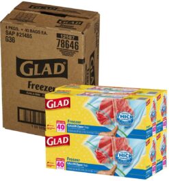 Glad Trash & Food Storage Zipper Food Storage Freezer Bags – Gallon Size – 40 Count Each (Pack of 4) (Package May Vary) (5124985). Glad food storage bags prevent food from being destroyed and dried out with freezer burn. These bags have an Extra tight and wide closure, which locks in freshness easily and securely. The extra thick and durable plastic help to ward off freezer burn by preventing air from reaching the Food.