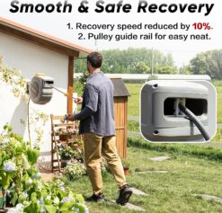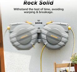 - Slow and Safe Auto Rewind System: The powerful spring of automatic hose reel has passed 20000 tensile tests, which guarantees to slower the speed by 10% while ensuring smooth rewind system. It won’t “swing” randomly and hurt the operator even in the off-hand state; All guides are designed to suit the size of different hoses which helps hoses to unwind smoothly each time without tangling.