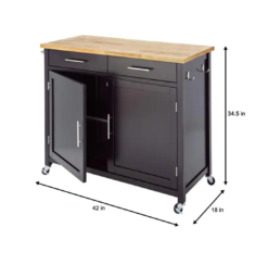 Able to function as an island, this stylish kitchen cart is perfect for adding storage space to your kitchen. Two drawers and two doors offer plentiful concealed space for storing your kitchen needs, and the adjustable shelf will help keep your kitchen essentials handy. Two side hooks are available for towels, and the kitchen cart has easy-roll locking casters for your convenience. You can choose from two sleek colors in black or true white, all with a solid butcher block wood top. There is some assembly required.