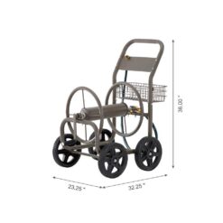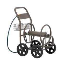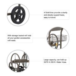 Get ready to own this attractive hose reel cart to make life easier. It crafted of high quality steel-frame with charming grey powder-coated finish, which is durable and weather-resistant. Featured with heavy-duty hose reel can hold up to 250 ft. of 5/8 in. water hose. The four 10 in. tough wear-resistant solid tiers offers a sturdy support base with great maneuverability. It will be a perfect addition to any of your gardening, farming or other outdoor jobs. This verstatile and portable garden cart is wothy of your exploration and discovery.