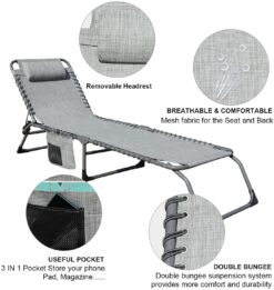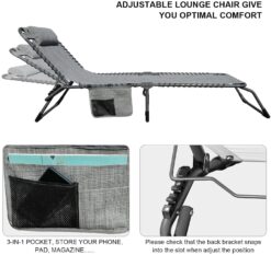 2.Folding lounge chair upgraded with sturdy steel frame and Breathable Textilene fabric for longevity,and each lounge designed with a Side Pocket,Great for storing your Phone,Pad, water bottle,Magzines, books & More.
