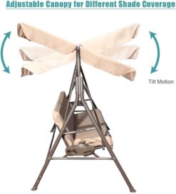 Durable Metal frame supports up to 500 lbs. The Stable triangular base is designed with unique Style Heavy Springs connect the chair to the frame, ensuring a smooth, gentle rocking motion. Perfect for porch, patio, garden, balcony and poolsideThe adjustable canopy can be set at Various angles to provide optimal shade and protection from the sun’s harmful UV rays against the rain and dust,Upgraded with 2 Utility Tray, Suitable for holding drinks and food during your leisure timeEasy to assemble and clean.Overall Dimension:67.5″(W)x 44″(D) x 59″(H)