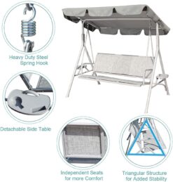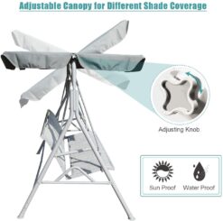 Durable Metal frame supports up to 550 lbs. The Stable triangular base is designed with unique Style Heavy Springs connect the chair to the frame, ensuring a smooth, gentle rocking motion. Perfect for porch, patio, garden, balcony and poolsideThe adjustable canopy can be set at Various angles to provide optimal shade and protection from the sun’s harmful UV rays against the rain and dust,Upgraded with 2 Utility Tray, Suitable for holding drinks and food during your leisure timeEasy to assemble and clean.Overall Dimension:67.5″(W)x 44″(D) x 59″(H)
