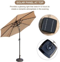 5.Airvent Top: 9ft Patio LED Umbrella designed with wind airvent on the top that can make your umbrella more stable against windy condition, it wide enough to your 42″ to 54″ round or square table. The Pool Umbrella provide a perfect shade for your patio, garden, deck, backyard. we recommend closing