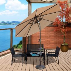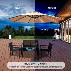 Designed with 5 New Crystal Shape LED lights on each rib and A Center brighter Light9 ft canopy provides shade for two side-by-side pool lounge chairs and an outdoor dining table for 4-6 people.UV Protection & Water Resistance Canopy can block up to 90% of harmful UV raysAir-vent canopy help wind and heat ventilation, make cantilever umbrella remain fresher.