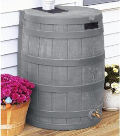 - Sleek Rain Barrel: Harness the power of nature with this sleek gray faux wood rain barrel, designed to capture and conserve rainwater; Complete with a brass spigot, effortlessly link up your hose or utilize it as a convenient overflow outlet