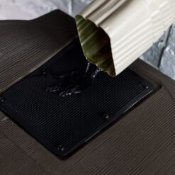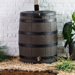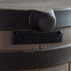 The Rain Wizard 50 with Darkened Ribs is a rustic, faux oak rain barrel with a distressed wood-grain texture that’s highly detailed. It holds 50 gallons and has a fine mesh screen to keep out debris along with front-facing overflow. This barrel features connection points for linking to other rain barrels and a flat-back that can sit right up against exterior walls. A standard 3/4” brass spigot is included. Incredibly strong, this rain barrel can take heavy impacts and holds up against the weather thanks to its sturdy, BPA-free plastic construction.