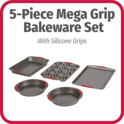 - DURABLE CARBON STEEL CONSTRUCTION KITCHEN BAKEWARE SETS: GoodCook Mega Grip 5-Piece Bakeware Set, featuring full-size baking essentials such as a cookie sheet, two 9-inch round cake pans, 13 x 9 bake pans, and 12 cup muffin pan.