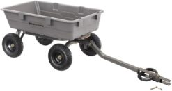 The brand new Gorilla Carts 800-lb. Capacity Poly Dump Cart is engineered to help you get the job done. The innovative, powder-coated steel frame design reduces assembly time by minimizing the number of components and offers exceptional maneuverability, great ground clearance, and a tight turn radius. The patented quick-release dumping system makes unloading this yard wagon fast and easy, and the 800-lb. hauling capacity means this cart can handle tough jobs. Perfect for DIY, farming, or gardening. The long-lasting, high-strength poly bed is maintenance-free, easy to clean, and rust-resistant to provide years of dependable service. The 2-in-1 convertible handle allows the cart to be pulled by hand or quickly changed to a hitch for towing, making it the perfect heavy-duty alternative to a wheelbarrow for all your outdoor needs. The hauling cart bed measures 38″ x 20″, has an overall height of 20.25-inches, and weighs 37.5-pounds. Gorilla Carts’ full line of products meets the needs of the light-duty homeowner as well as the commercial-duty professional user by offering lawn carts and wagons in a wide variety of sizes and weight capacities. The Gorilla Carts GOR5 Poly Garden Dump Cart comes with a 1-year limited warranty.