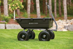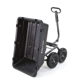 The newly-designed Gorilla Carts 1200-lb. Capacity Heavy-Duty Poly Garden Dump Cart has an innovative, updated frame design that makes it quick and easy to assemble and put this cart to work. The cart features the patented quick-release dumping system so the cart can be loaded and unloaded with ease, and the balanced 4-wheel design makes it a simple-to-use alternative to a wheelbarrow. The new frame design allows for easy assembly, while improving maneuverability and rigidity, increasing ground clearance, and giving the cart a tight turning radius. The tough and durable poly bed is maintenance-free and easy to clean, and the 13 in. pneumatic tires are designed to handle any terrain whether you’re hauling heavy dirt, mulch, gravel, or plants. The convertible 2-in-1 handle makes it simple to switch between pulling the cart by hand or towing behind a lawn tractor. With a 1,200 lb. hauling capacity, this cart is perfect for any job around the home, garden, or farm. The bed dimensions measure 40-inches by 25-inches, and the cart has an overall height of 26.2-inches and weighs 54-pounds. Gorilla Carts full line of products meets the needs of the light-duty homeowner as well as the commercial-duty professional user by offering a wide variety of carts in different sizes and weight capacities. The Gorilla Carts GOR6PS Heavy-Duty Poly Garden Dump Cart comes with a 1-year limited warranty.