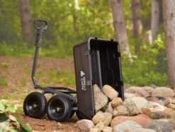 Features: Comes with a 1-year limited warranty, Heavy-duty garden cart moves supplies and has a patented quick-release dump feature to make unloading fast and easy, 13-inch tires will tackle any terrain and padded convertible handle can be pulled by hand or hooked-up behind a lawn tractor or ATV, 1,200-pound hauling capacity, height of 25-inches and weighs 58.6-pounds, Designed with a 40-inch by 25-inch rust resistant poly bed, steel frame and black finish
