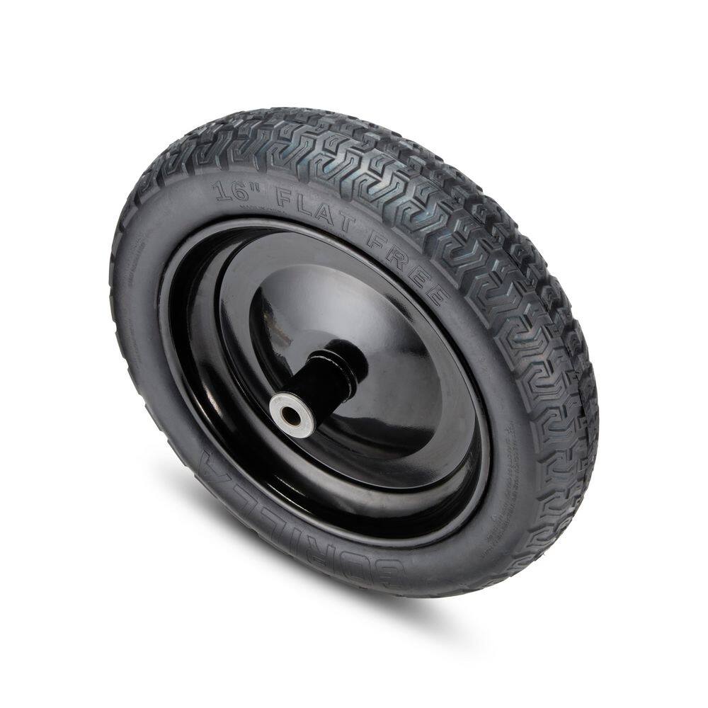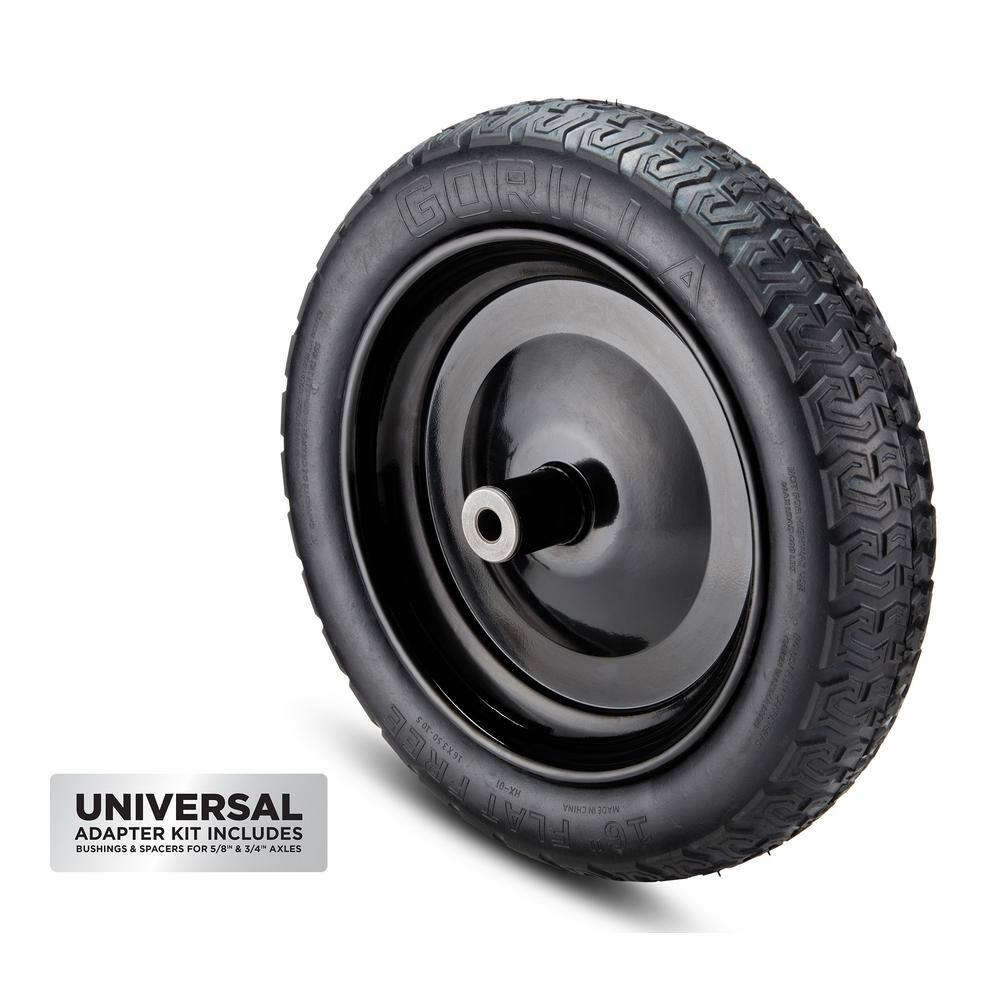 The all-new Gorilla flat free tire does not need air and features a solid polyurethane design so you’ll never be stuck with a flat tire, a great replacement for pneumatic air-filled tire. Features heavy-duty bushing, 5/8 in. axle bore and includes an adapter kit for proper fitting. The universal adapter kit allows you to use these tires with any make or model requiring a 16 in. tire.
