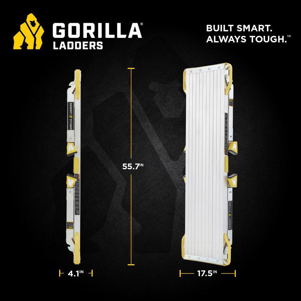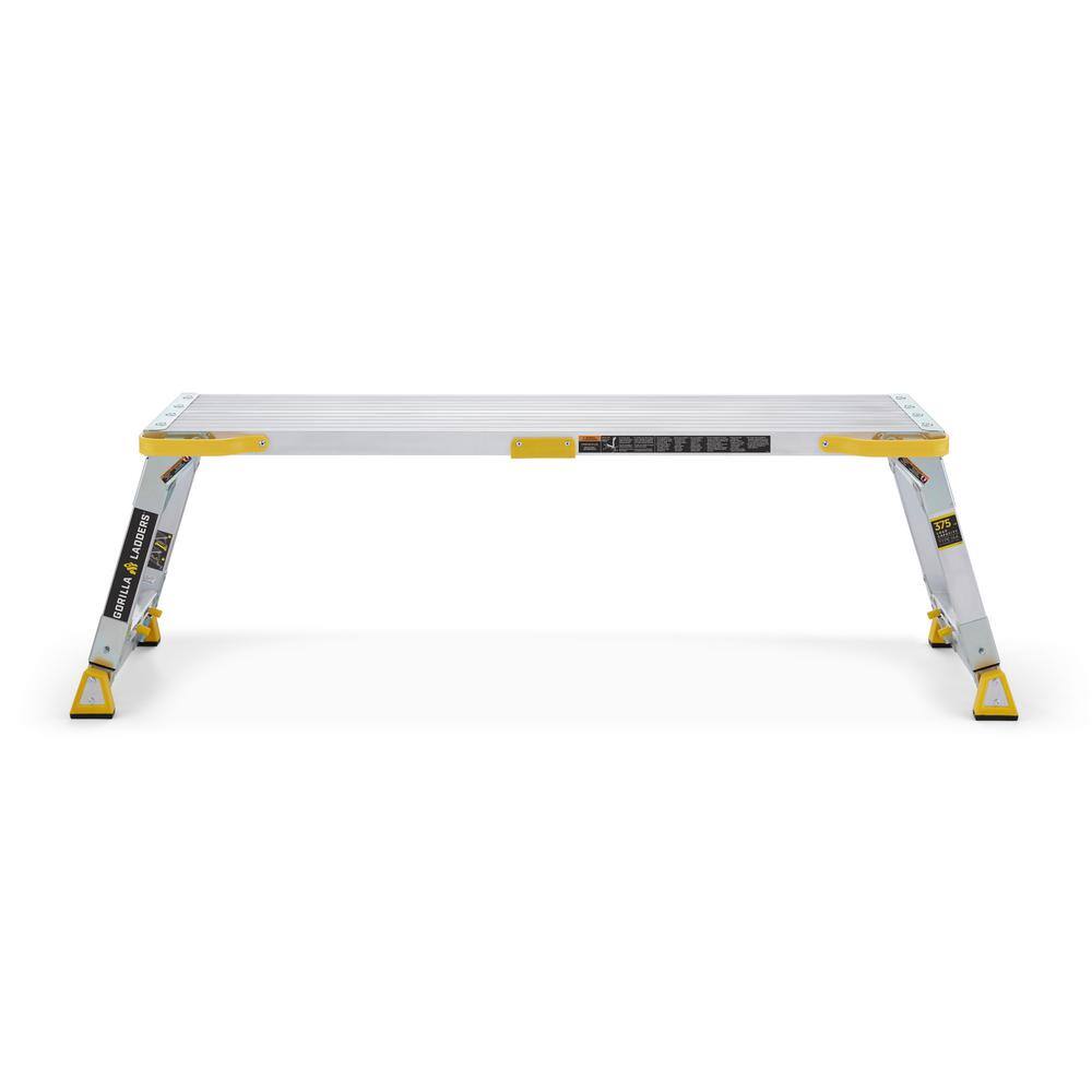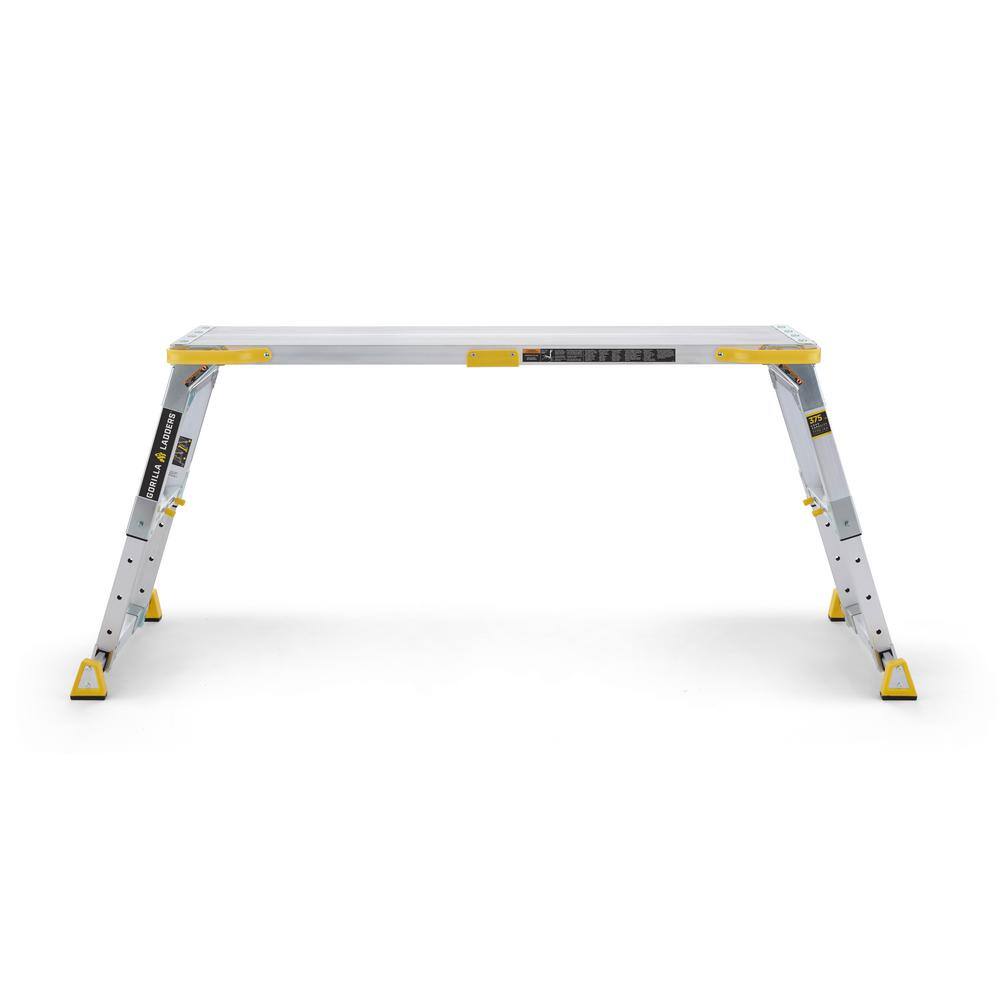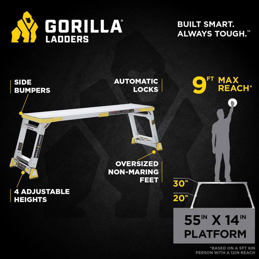 The all-new Gorilla Ladders Heavy-Duty Adjustable Aluminum PRO Slim-Fold Work Platform is like having 4 different work platforms in 1. Easily adjust this work platform between 4 different heights. The 55 in. x 14 in. platform provides an extra-long work surface, built to stay in 1-place longer saving time. With bumpers to protect work site walls and telescoping feet, it is versatility mixed with practicality. The 20 in. to 30 in. standing height is perfect for painting, hanging drywall, ceiling work or just as a work bench. The non-slip tread and oversized non-marring feet improve stability. With a slim fold design and a 375 lbs. weight rating, this professional grade adjustable work platform is the ultimate jobsite companion.