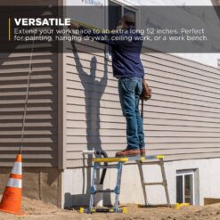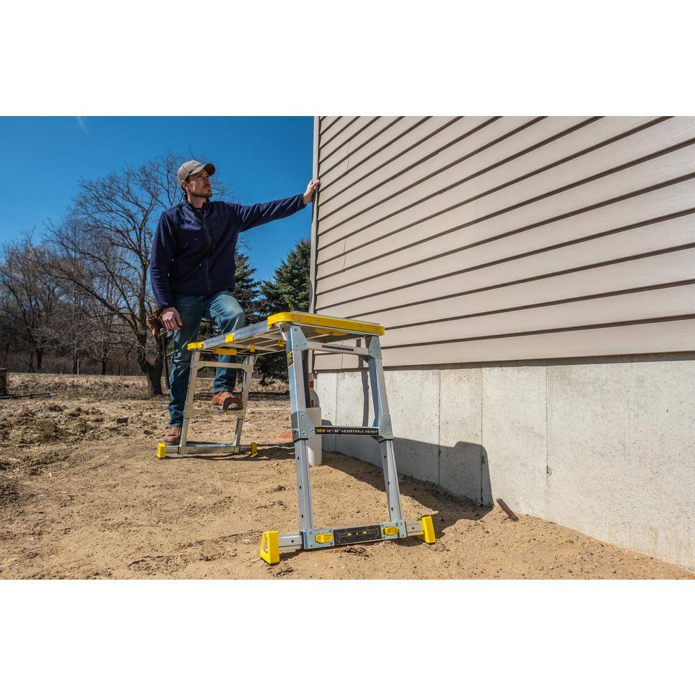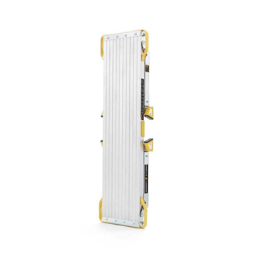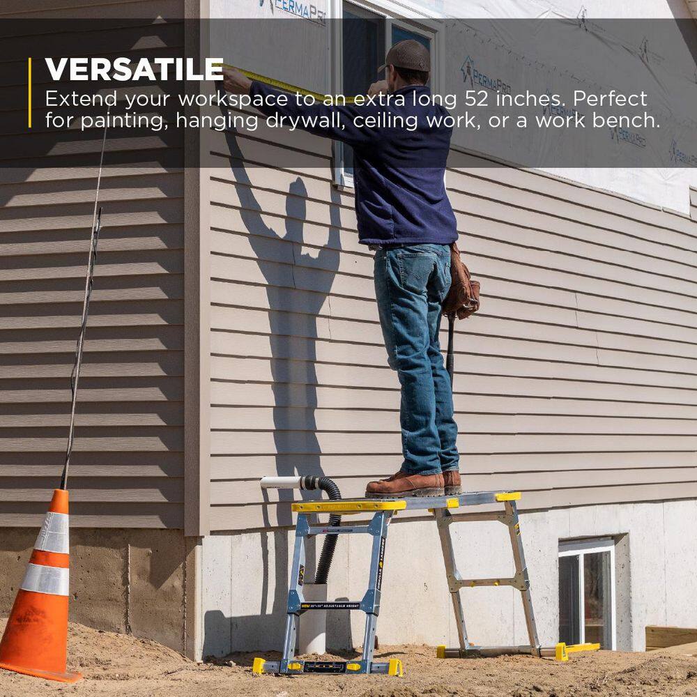 The all-new Gorilla Ladders Heavy-Duty Adjustable Aluminum PRO Slim-Fold Work Platform is like having 4 different work platforms in 1. Easily adjust this work platform between 4 different heights. The 55 in. x 14 in. platform provides an extra-long work surface, built to stay in 1-place longer saving time. With bumpers to protect work site walls and telescoping feet, it is versatility mixed with practicality. The 20 in. to 30 in. standing height is perfect for painting, hanging drywall, ceiling work or just as a work bench. The non-slip tread and oversized non-marring feet improve stability. With a slim fold design and a 375 lbs. weight rating, this professional grade adjustable work platform is the ultimate jobsite companion.
