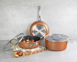 Save space in your kitchen and revolutionize the way you cook with the product. Their uniquely designed cookware lets you easily stack and nest pots and pans – saving you 30% space in your kitchen and opening up precious cabinet space. This cookware set is triple coated with their ultra-nonstick cast-texture coating which doesn’t need to be pre-seasoned, ensures the ultimate release, is durable to withstand metal utensils and is dishwasher safe! The Gotham Steel 10 Piece Aluminum Non Stick Cookware set saves space in your kitchen and revolutionize the way you cook with the product.