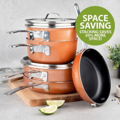 - SPACE SAVING – This pots and pans set revolutionary new design allows you to easily organize your cabinets & kitchen by stacking and nest the entire cookware set together, saving you 30% more space & freeing up precious cabinet space.
