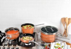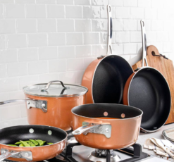 Revolutionize the way you cook and the way your kitchen cabinets look with Gotham Steel Stackable Space Saving cookware. Constructed with a triple coated cast-texture coating, this Gotham Steel Stackable is the perfect balance for ultra-nonstick and long-lasting durability. They can withstand metal utensils and are dishwasher safe for easy clean up. Gotham Steel Stackable cookware has a unique design that saves 30% more cabinet space; it allows the aluminum pans, pots and glass lids to nest together as a secure stack. This cookware set features popular pots and pans needed for everyday cooking, baking and even roasting.