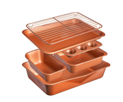 - with tempered glass lid, cookie sheet, loaf pan, square baking pan, large baking pan with rack and muffin pan