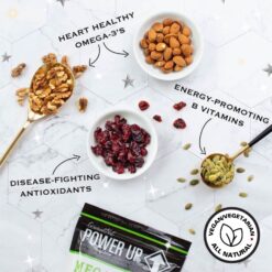 - More Than Your Average Trail Mix – Power Up’s Mega Omega mix is a delicious blend of nuts, fruits and seeds. Walnuts and almonds provide you with Omega-3 “heart-healthy” fatty acids, while the mango fruit and cranberries are a source of antioxidants. Add a dash of protein and vitamin B rich pumpkin seeds and you’ve got the perfect, healthful snack.