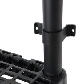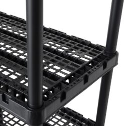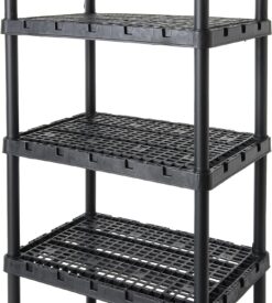 Interlocking components injection-molded from single-piece plastic resin make the assembled shelf unit lightweight, long-lasting, and suitable for heavy-duty storage.