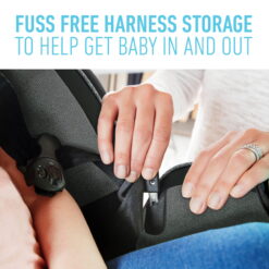 - Rubberized Fuss Free harness storage holds the harness out of the way for a no-slip grip to get baby in and out