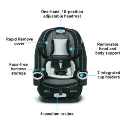 Graco 4Ever DLX 4-in-1 Car Seat gives you 10 years of use with 1 car seat, now upgraded with 3 additional features! The best-selling 4Ever you know and love now features a RapidRemove cover, an integrated belt lock-off for easy installation and rubberized Fuss Free harness storage for extra accessibility. It is comfortable for your child and convenient for you as it transitions from a rear-facing harness (4-40 lb) to forward-facing harness (22-65 lb) to highback belt-positioning booster (40-100 lb) to backless belt-positioning booster (40-120 lb). The Simply Safe Adjust Harness System and 10-position headrest lets you adjust the harness and headrest together with no rethreading. The 6-position recline keeps your child comfortable, while the InRight LATCH system makes installation easy. It’s the only car seat you’ll ever need!
