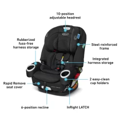 The Graco 4Ever DLX SnugLock 4-in-1 Car Seat gives you 10 years of use with one car seat, and features SnugLock technology. The best-selling 4Ever you know and love now installs in less than one minute using vehicle seat belt or LATCH. The 4-in-1 car seat is comfortable for your child and convenient for you as it transitions from a rear-facing harness (4–40 lb) to forward-facing harness (22–65 lb) to highback belt-positioning booster (40–100 lb) to backless booster (40–120 lb).