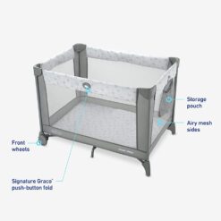 - Mesh storage pouch for keeping baby’s essentials, including wipes and toys, right on playard