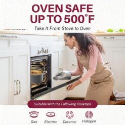 - COOKTOP & OVEN SAFE – Compatible with gas, electric, glass cooktops & oven safe up to a sizzling up to 500° Fahrenheit, lids included! Please note, this set isn’t compatible with induction cooktops