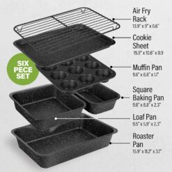 - Complete Bakeware Set: This Granitestone bakeware set includes everything you need to start baking and cooking like a pro in your kitchen. The set comes with an air fry rack, an XL cookie sheet, a jumbo muffin pan, a full sized square baking pan, full sized loaf pan, and a roaster pan.