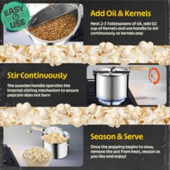 - EASY TO CLEAN – This popcorn pan is made of durable stainless-steel that is easy to clean without requiring any soap and water. Simply wipe the inside of the popcorn popper and store it away for later use.