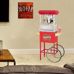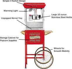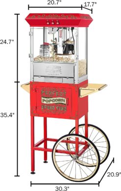- DETACHABLE POPCORN CART – The portable popcorn machine cart features 17.5-inch bicycle-style wheels, a storage supply cabinet, and a large working shelf. Set up a popcorn stand at your next party or display the movie theater popcorn machine in your den.