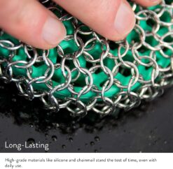 - Keep Seasoning Safe: When you put in the work to build a great seasoning in cast iron, the last thing you want is to hurt it cleaning. No need to fear; with our scrubber, the ringed chainmail cleans all the gunk and crust but leaves that seasoning perfectly intact.